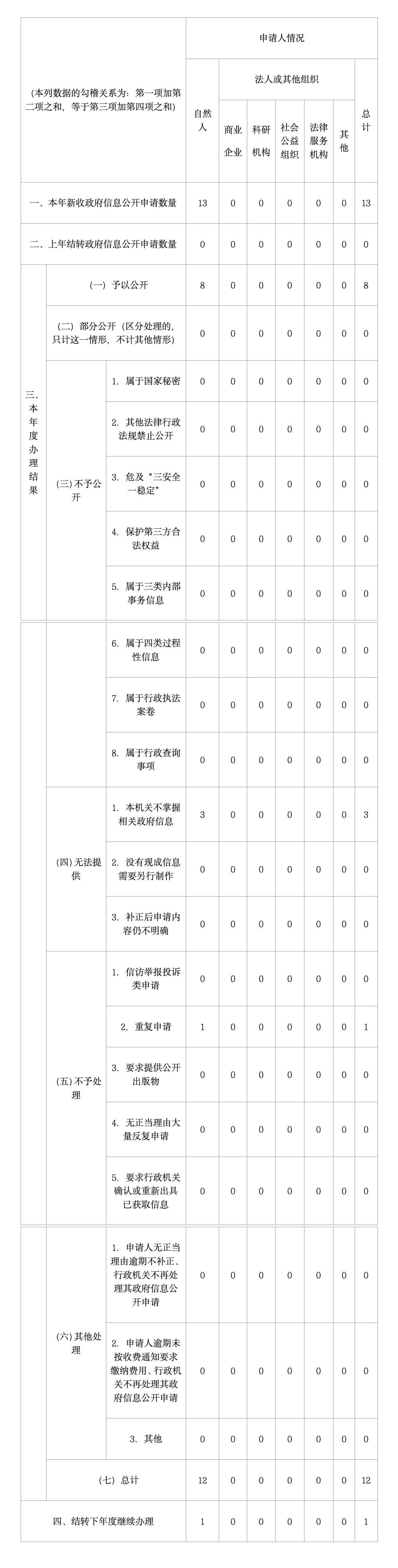 2025年,我办(局)共收到政府信息公开申请13件,其中12件已办结,1件结转下年度继续办理。
